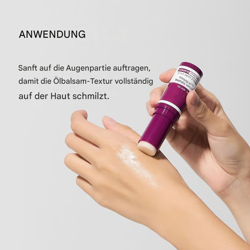 - Drehen und gleiten: Sanft auf die Augenpartie auftragen und den Balsam in die Haut einziehen lassen.