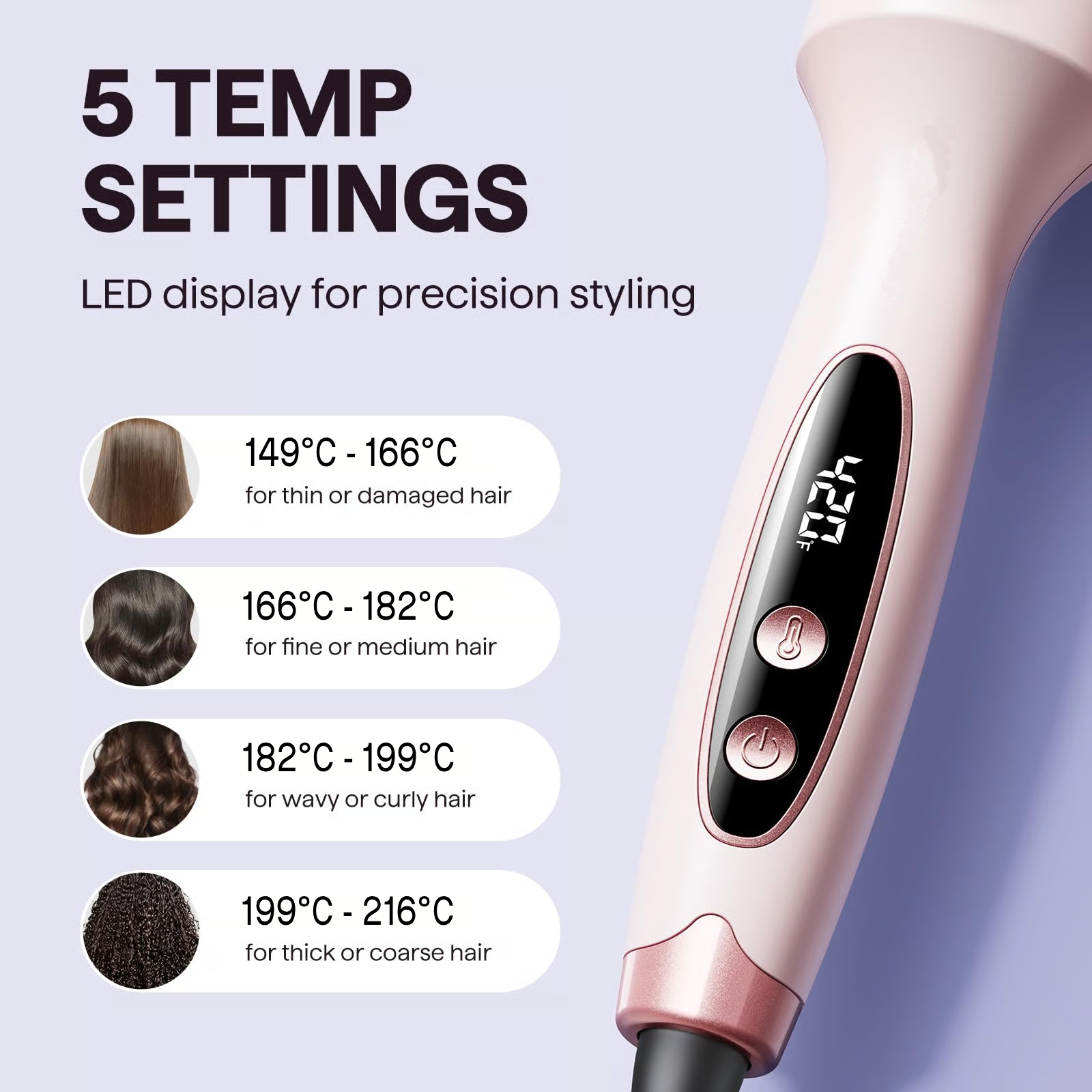 - Choose Your Temperature: Select the right heat setting for your hair type using the LED display.